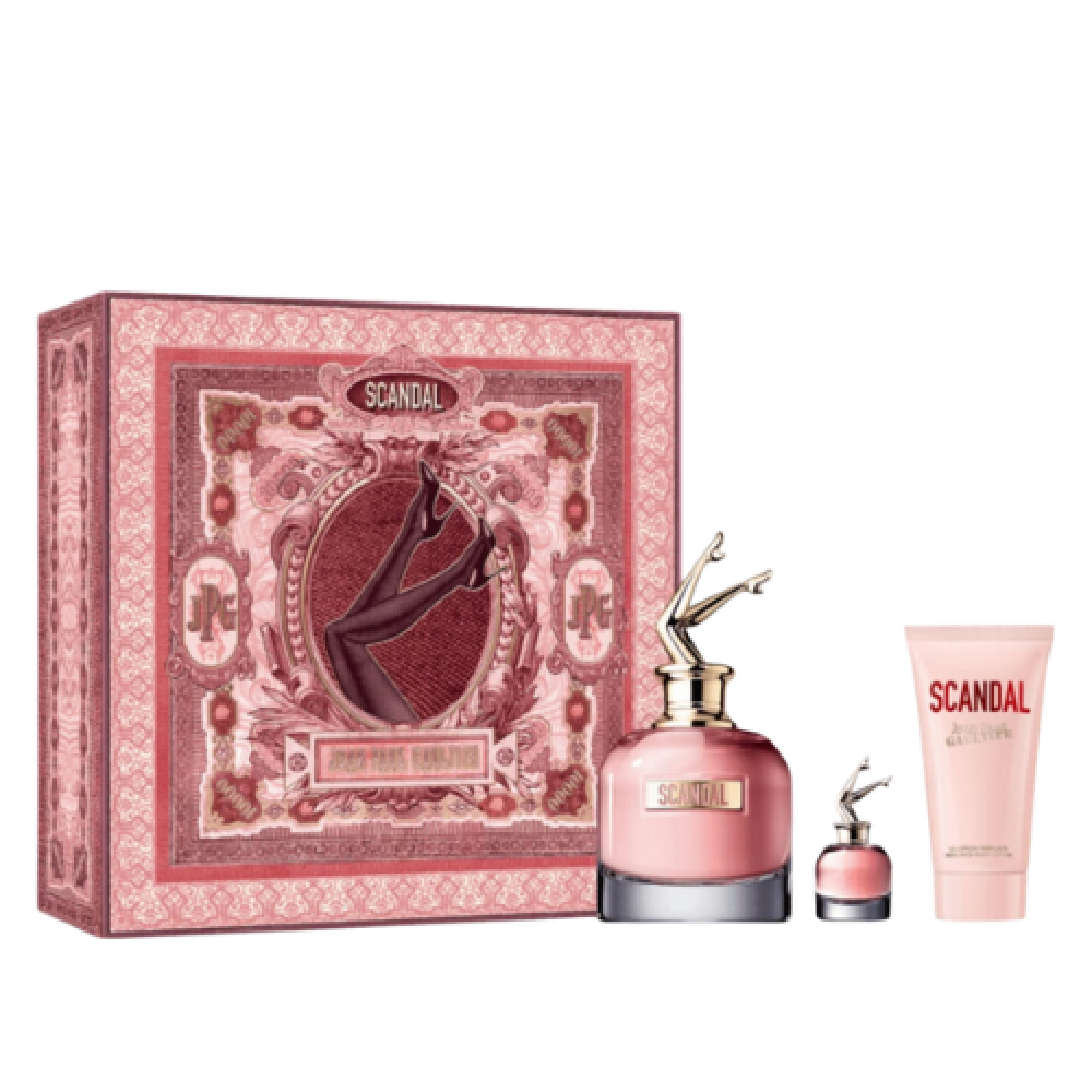 - عطر جان بول غوتييه سكاندال أو دو بارفان (80 مل): هو العطر الأساسي في المجموعة، ويتميز برائحة عطرية زهرية عسلية جذابة تدوم طويلاً. يفتتح العطر بنفحات منعشة من الحمضيات (البرتقال الأحمر) والجاردينيا، ثم ينتقل إلى قلب العطر الذي يضم العسل وزهر البرتقال. أما قاعدة العطر فتتكون من الباتشولي والفانيليا وخشب الصندل، مما يمنحه عمقًا وجاذبية.